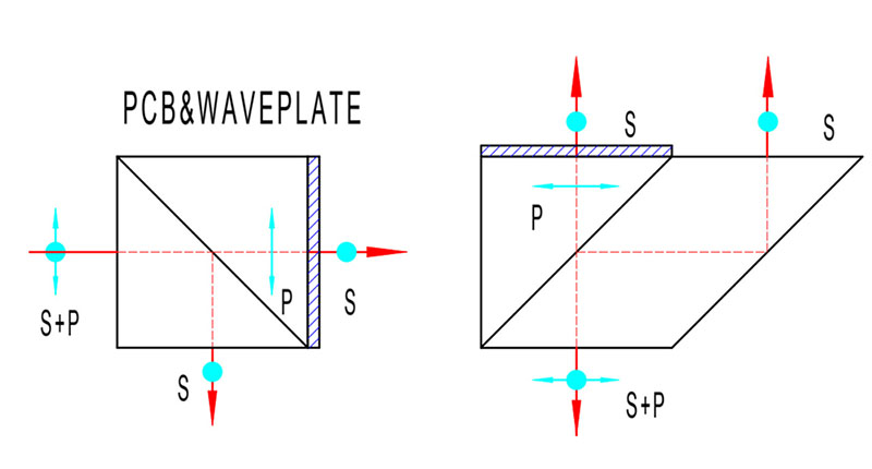偏振分光棱镜与波片组件是指对偏振态S&P两种偏振态的激光合束为一体。 45°半波片先对S偏振态激光进行偏振态的转化为P偏振态, 两束垂直的S&P偏振态经过偏振分光棱镜再合为一束圆偏振光。