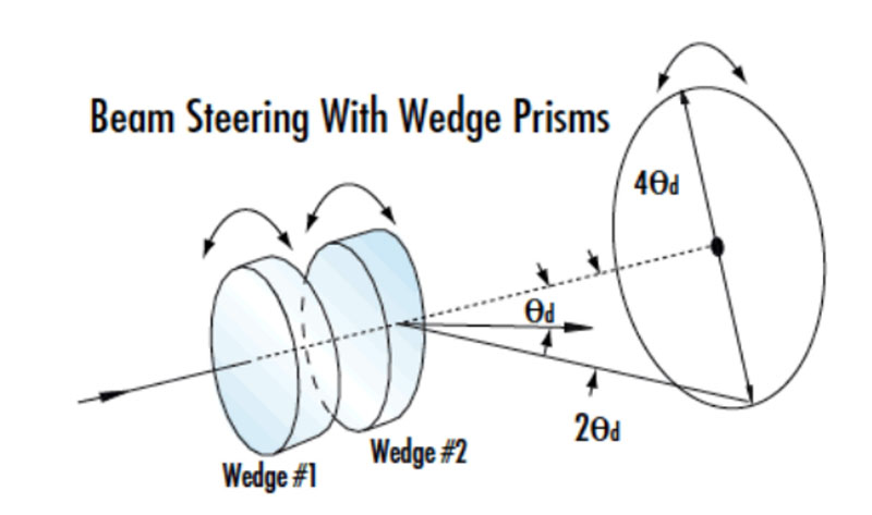 两个楔形棱镜可用来作为变形棱镜使用(用来校正激光管输出的椭圆形光束),或者用来将光束在4θ范围内以各种角度偏折,θ是指单个棱镜偏折的光。这种光束整形是通过分别旋转两个楔形棱镜来实现的,典型用于成像中的光束扫描不同位置。